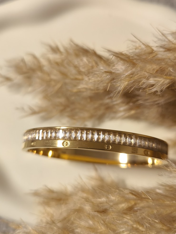 Unser Schmuck besteht aus hochwertigem Edelstahl und vergoldeten Elementen. Um den Glanz dauerhaft zu erhalten,vermeide Kontakt mit Wasser ,Parfüm , Cremes und Chemikalien. Lege den Schmuck vor dem Duschen, Sport oder Schlafen ab und bewahre ihn trocken auf. Zur Reinigung genügt ein weiches , trockenes Tuch.